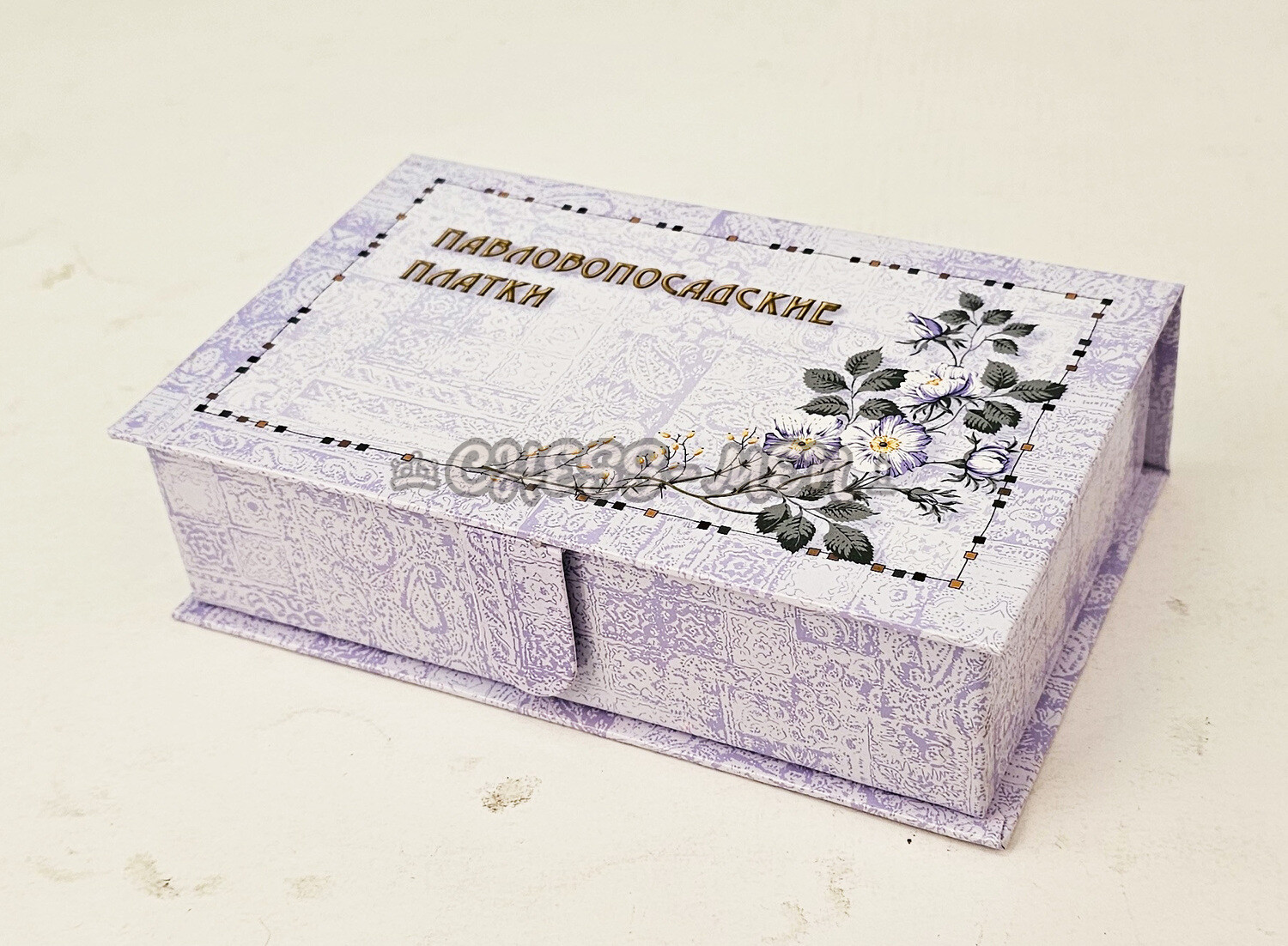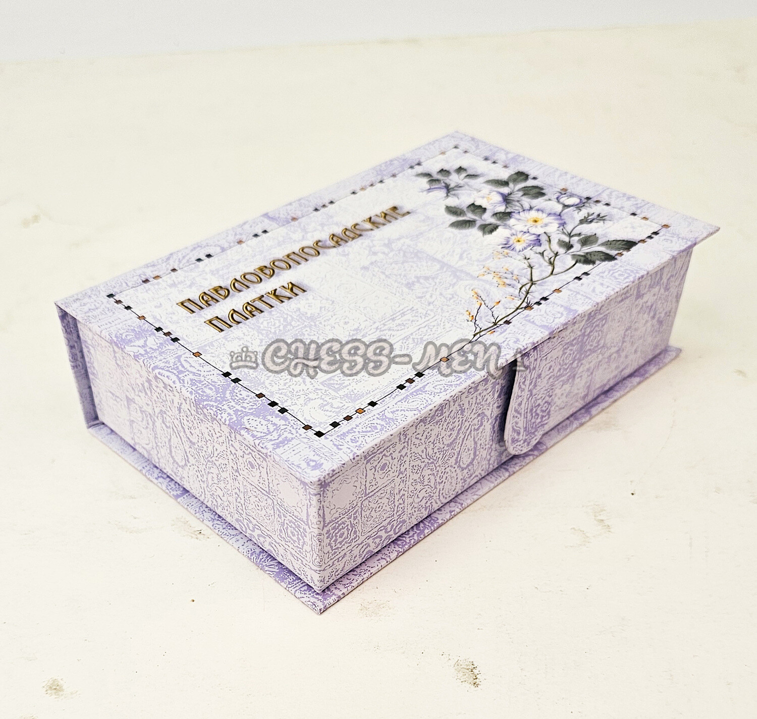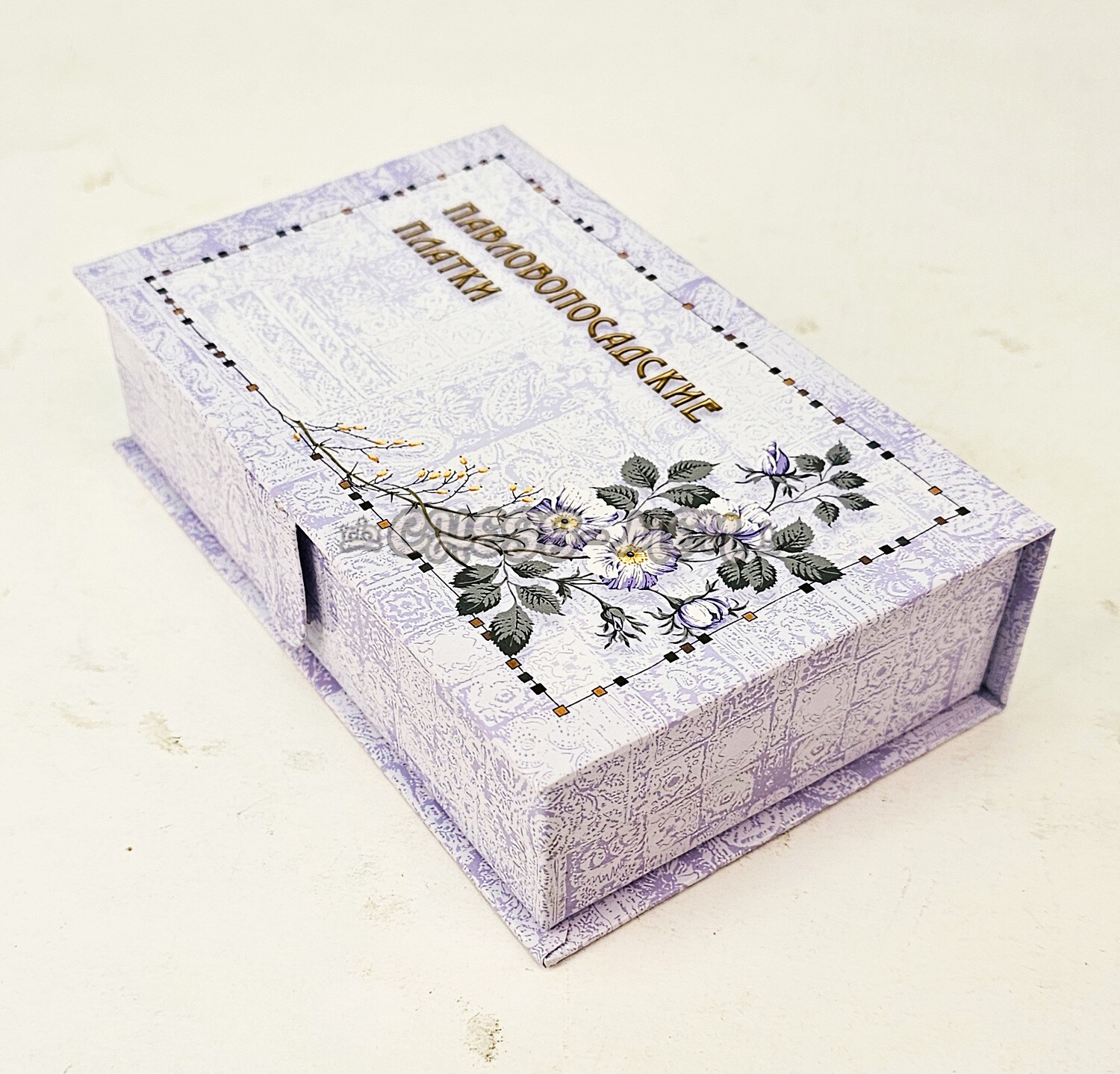 На крышке - красивый цветочный орнамент и надпись: ПАВЛОВОПОСАДСКИЕ ПЛАТКИ.