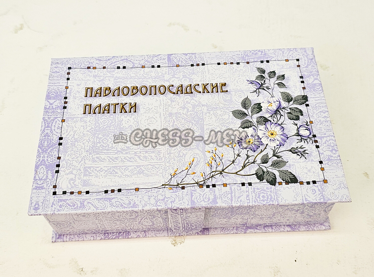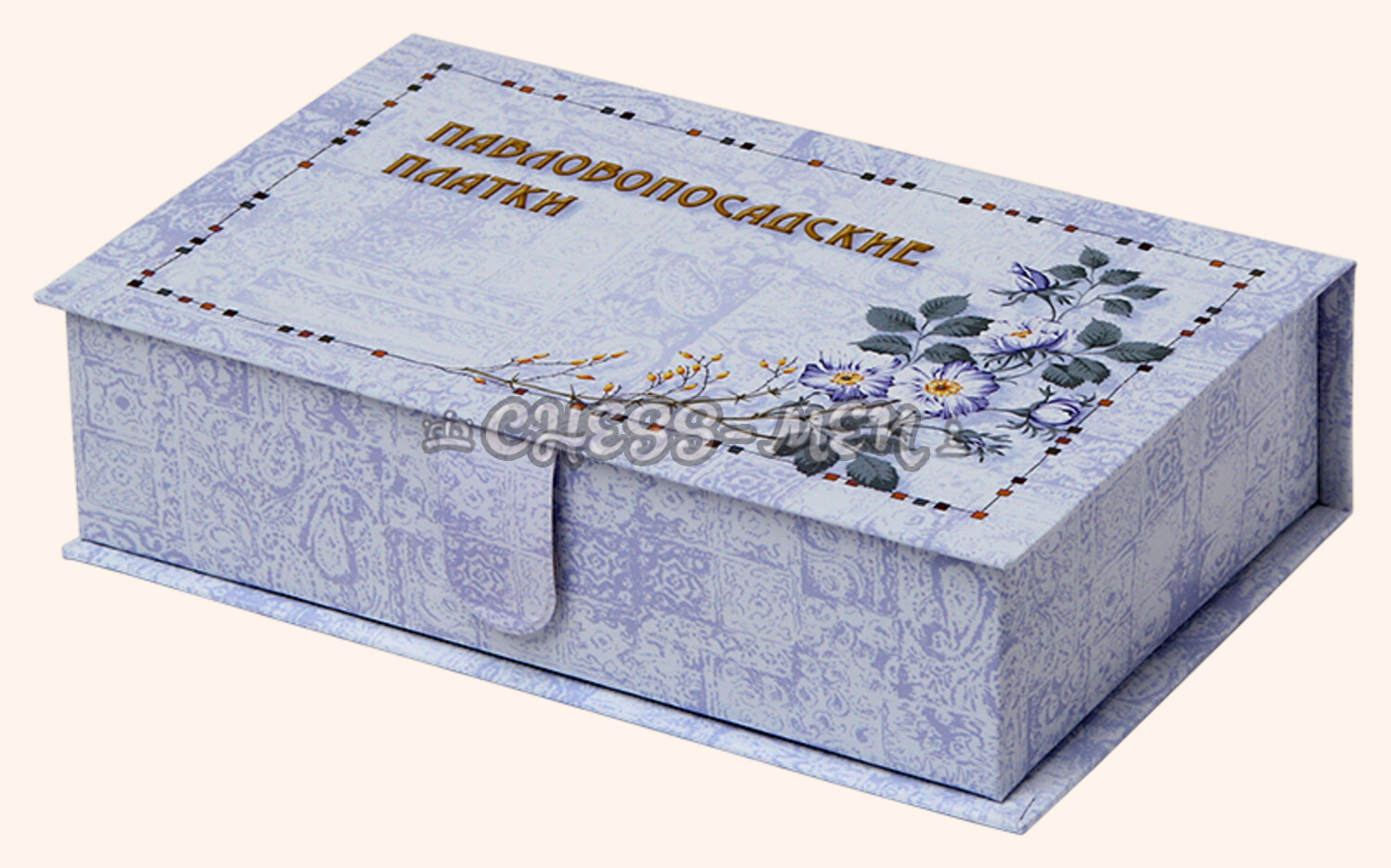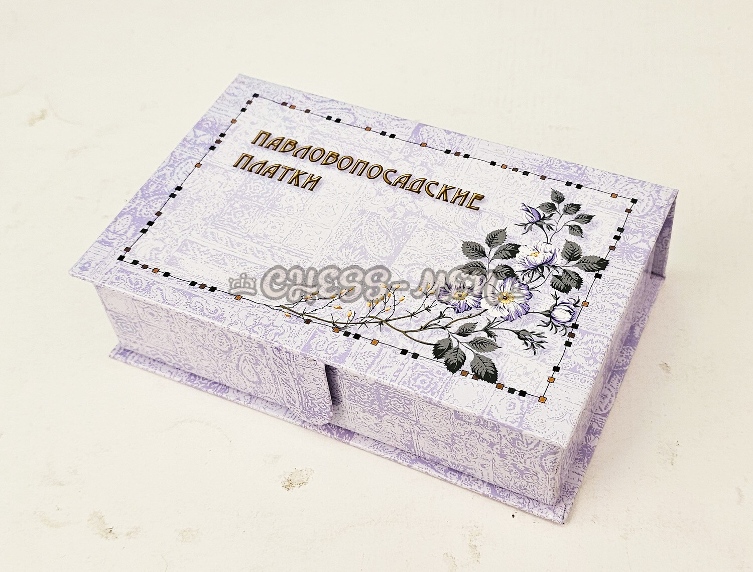 На крышке - красивый цветочный орнамент и надпись: ПАВЛОВОПОСАДСКИЕ ПЛАТКИ.