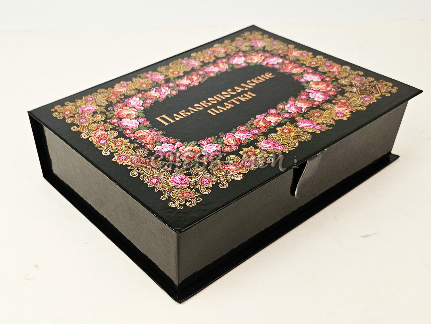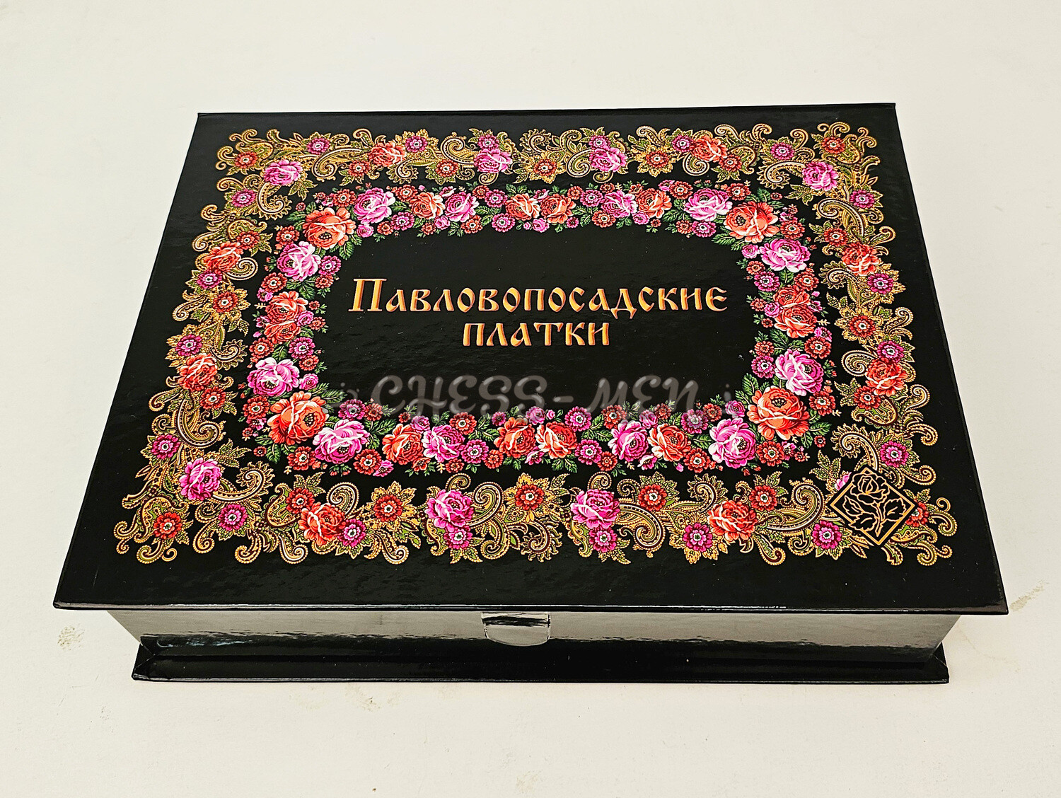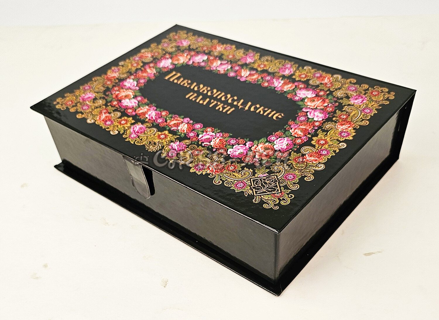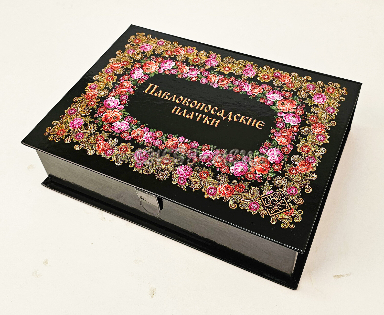 На крышке - красивый цветочный орнамент на тёмном фоне надпись: ПАВЛОВОПОСАДСКИЕ ПЛАТКИ