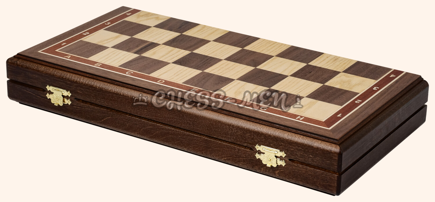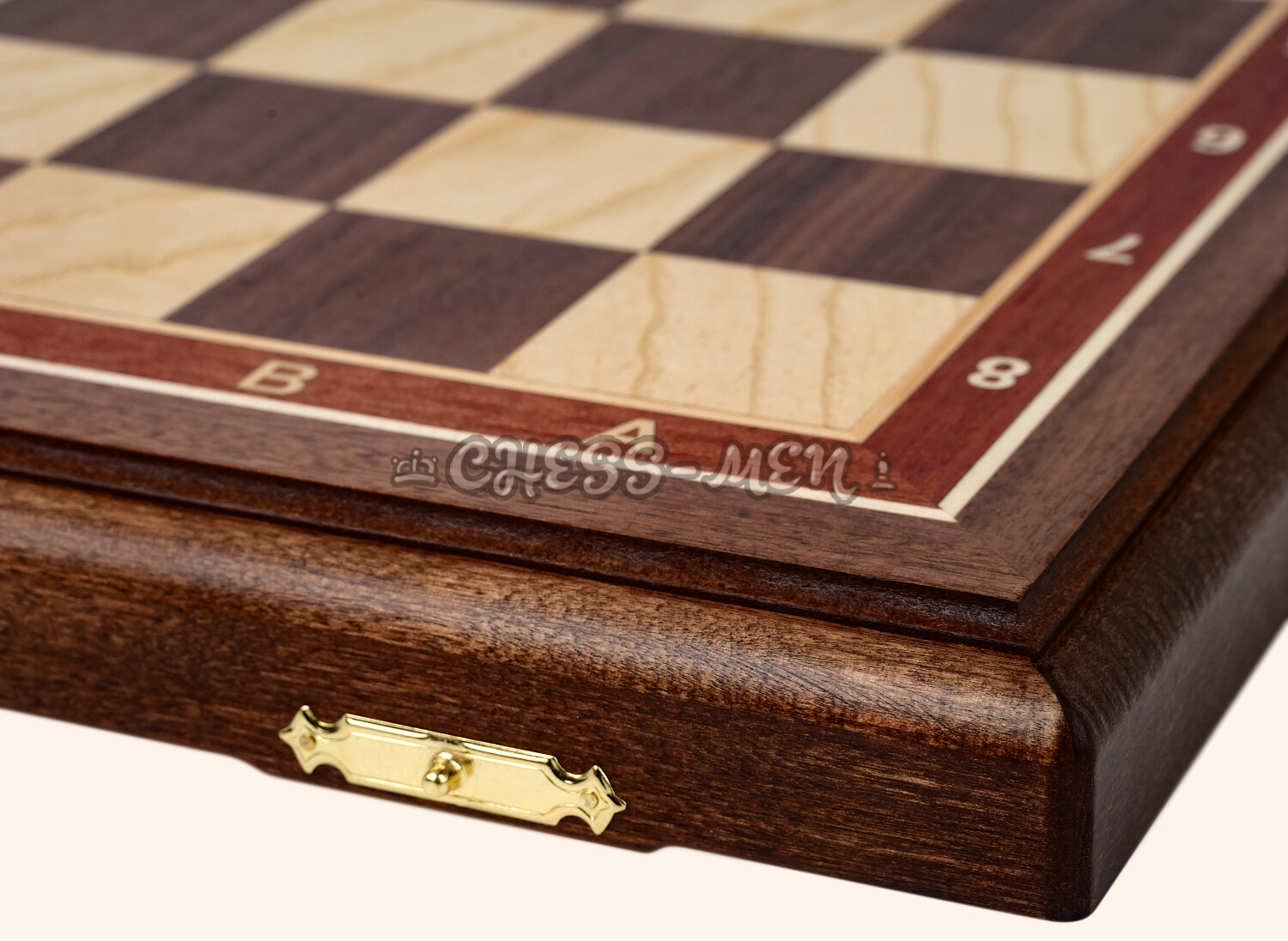 Каркас шахматной доски выполнен из бука. Для дополнительной надёжности на доске предусмотрено 2 замка, которые фиксируют шахматную доску в закрытом состоянии (обычно ставится 1 замок на доску)