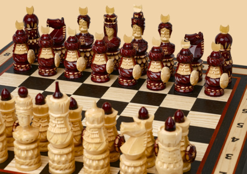 Фигурки для шахмат изготовлены полностью вручную мастером резьбы по дереву и покрыты снаружи лаком