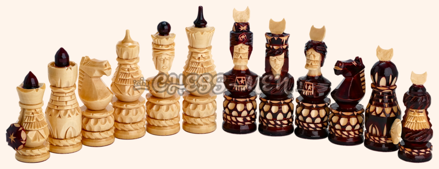 Фигурки для шахмат изготовлены полностью вручную мастером резьбы по дереву и покрыты снаружи лаком