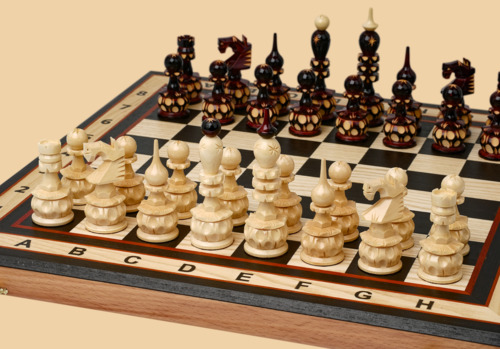 Фигурки для шахмат изготовлены полностью вручную мастером резьбы по дереву и покрыты снаружи лаком