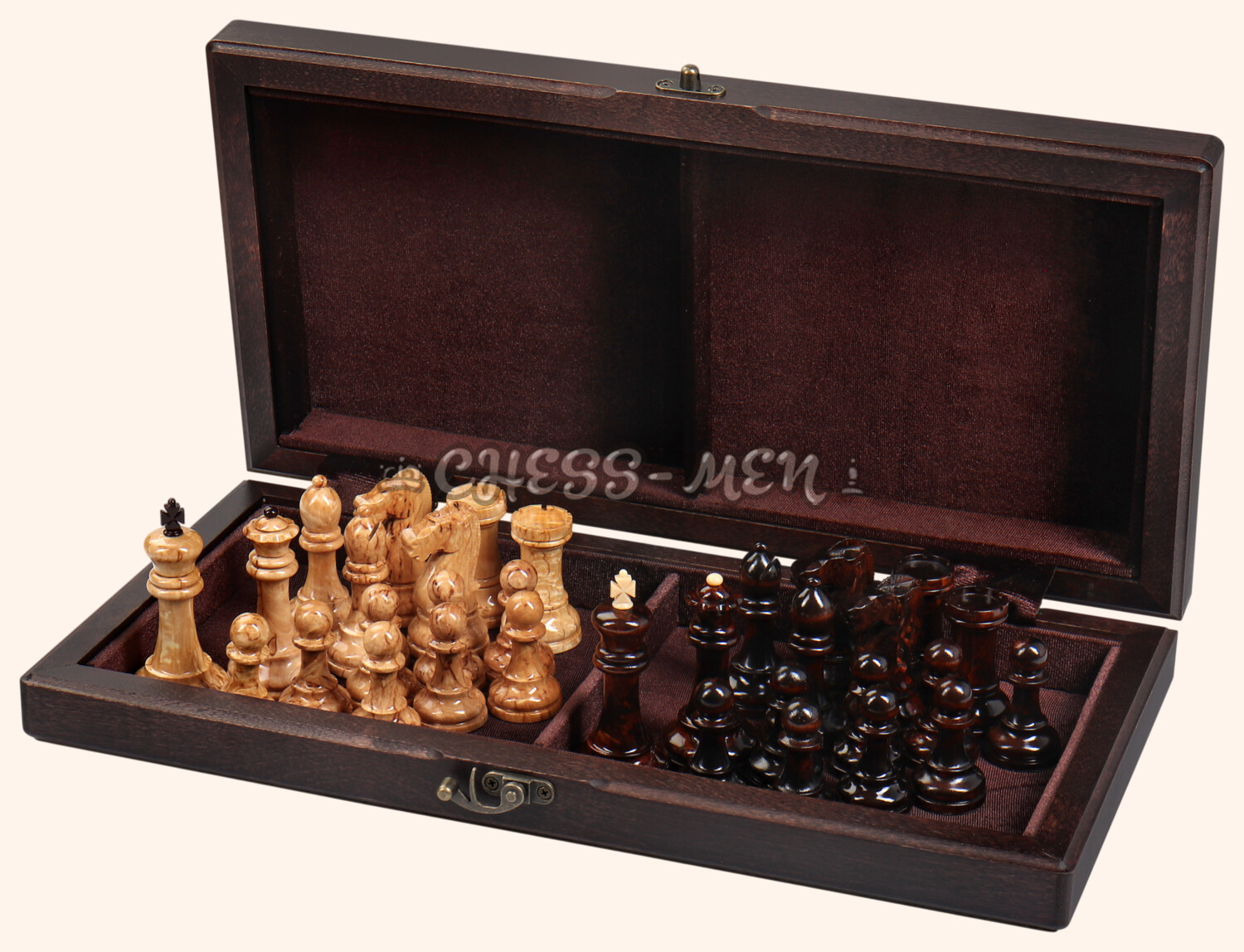 Внутри шахматная доска обшита специальной бархатистой тканью, которая защищает фигуры от ударов и при транспортировке они не гремят внутри неё.