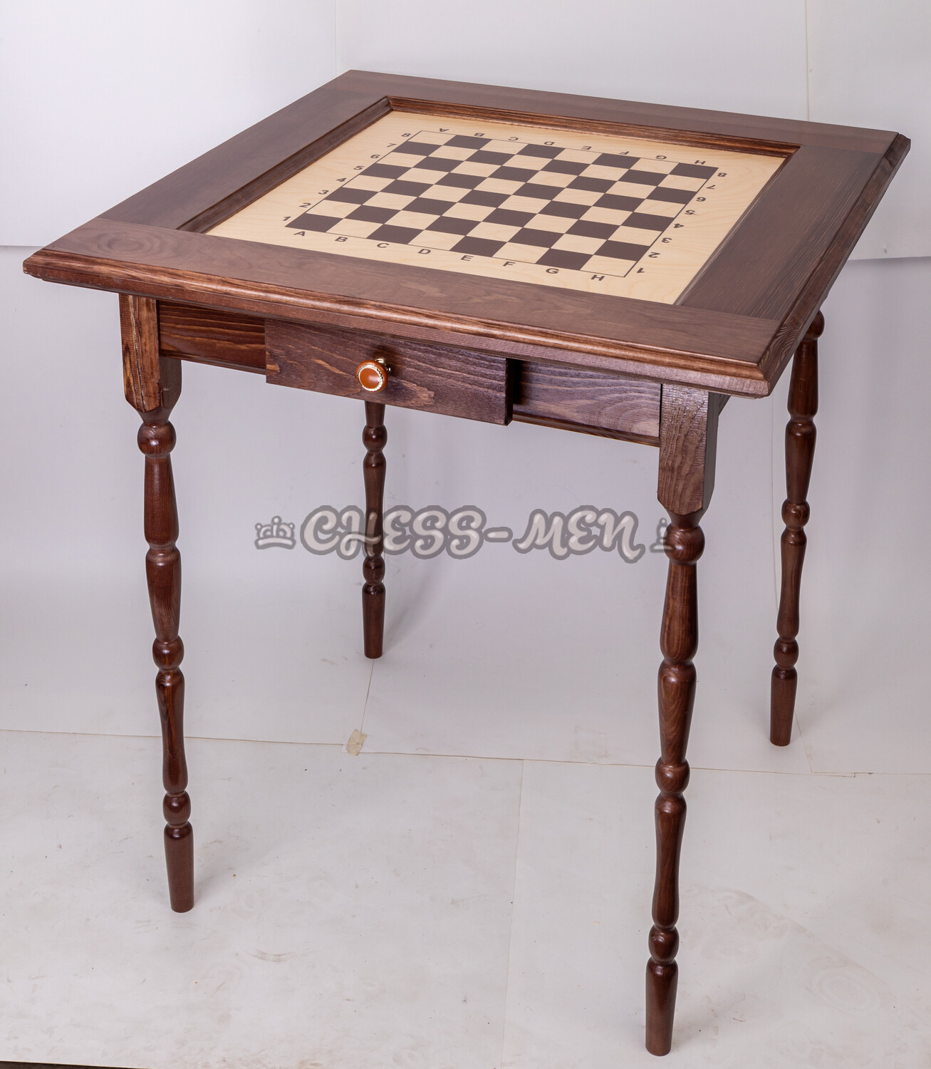 Материал шахматного стола: сосна, тонированная в тёмный цвет